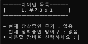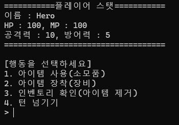 - 플레이어 행동 선택: 사용 / 장착 / 인벤토리 확인