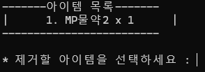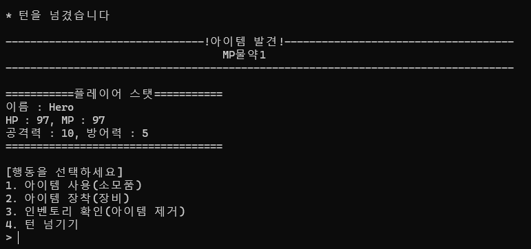 - 턴마다: hp/mp 3씩 감소, 소모품 사용 시 회복